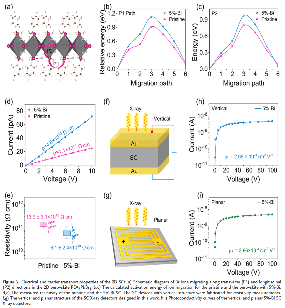 - 晶体结构优化与载流子传输增强:Bi³⁺掺杂引起晶格收缩,缩短层间距,提升载流子迁移率-寿命乘积,同时提高离子迁移活化能,抑制电流漂移,增强器件稳定性。