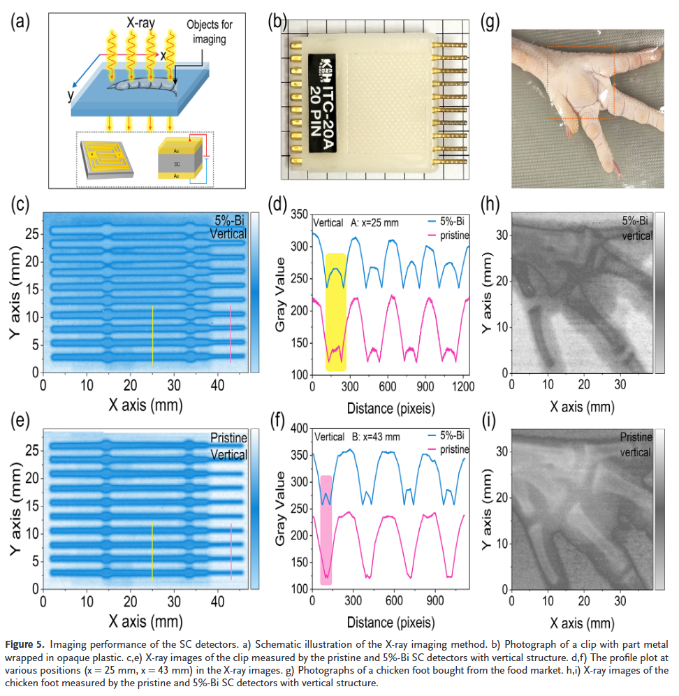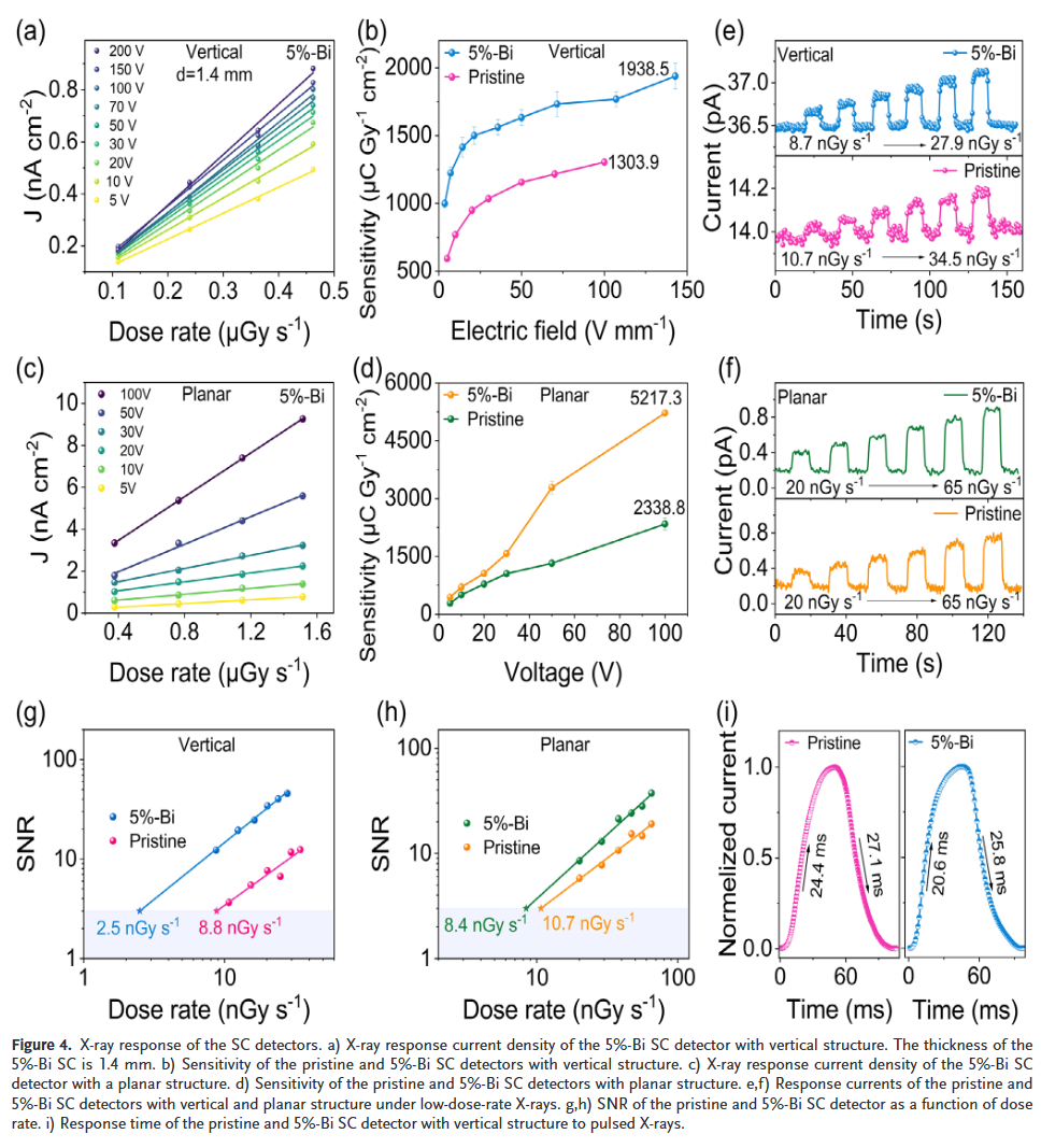 - 高性能X射线探测与成像:基于掺铋单晶的探测器实现了高达5217.3 μC Gy⁻¹ cm⁻²的灵敏度、2.5 nGy s⁻¹的探测限,并成功应用于高分辨率X射线成像,展现出优异的综合性能。