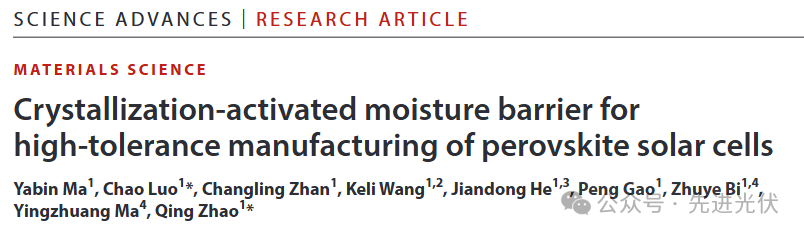 Ma, Y., Luo, C., Zhan, C. et al. Crystallization-activated moisture barrier for high-tolerance manufacturing of perovskite solar cells. Sci. Adv. 11, eady5703 (2025).https://www.science.org/doi/10.1126/sciadv.ady5703