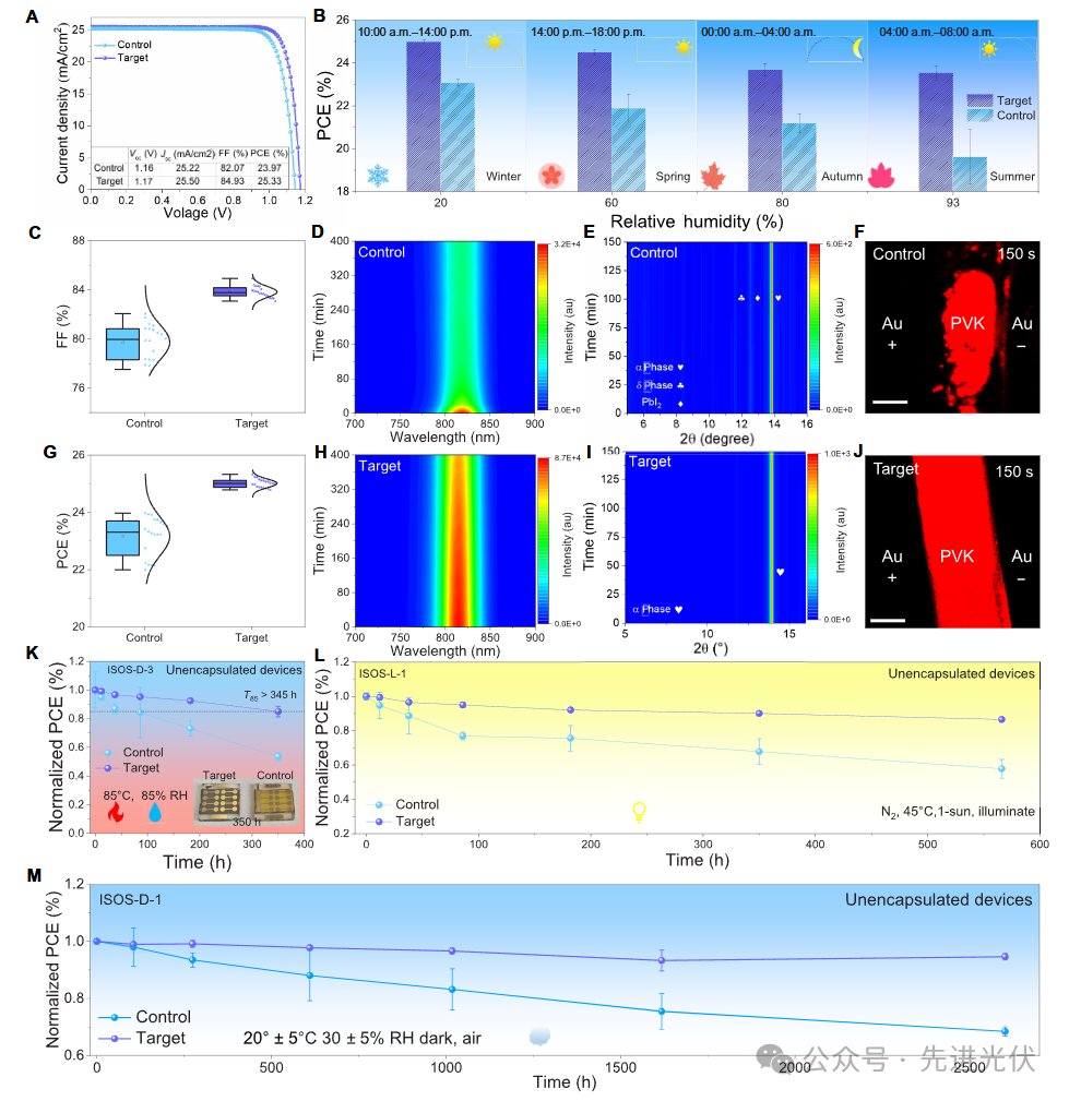 图5组 综合评估了屏障分子对器件性能的提升效果:J-V曲线显示冠军器件效率从23.97%提升至25.33%且填充因子超过84.93%,统计分布图表明DTAB使不同湿度下制备的器件效率标准差显著降低,原位PL/XRD老化测试证明DTAB器件在85°C热应力下能抑制δ相和PbI₂生成,CLSM电场耦合测试显示屏障分子可抵抗0.25V/μm电场下的离子迁移,最终器件在湿热(85°C/85%RH)、光照和大气环境下分别保持86.5%、84.9%和94.6%的初始效率,展现出卓越的工况稳定性。