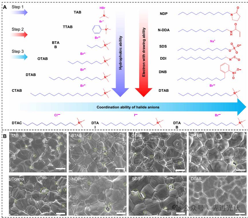 图2组 展示了屏障分子DTAB的理性筛选过程:通过系统比较不同烷基链长度(从TAB到CTAB)和官能团结构的分子发现,十二烷基三甲基溴化铵(DTAB)在SEM图像中表现出最完整的晶粒形态和最少的PbI₂残留,其十二碳链长既能提供足够疏水性又避免过长链导致的自组装空洞问题,而季铵盐基团与钙钛矿组分的静电相互作用能有效稳定晶界,分子设计路线图清晰体现了从结构单元优化到功能验证的完整逻辑链条。