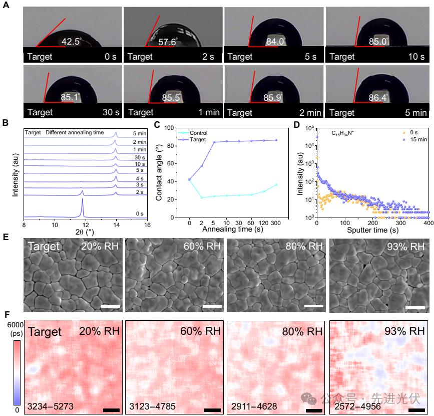 图4组 验证了固态/保护相阶段屏障分子的动态迁移机制:接触角测试显示DTAB在退火5秒内使薄膜疏水性从42°提升至84°,TOF-SIMS深度剖析证实DTAB从体相向表面迁移形成致密层,SEM图像证明在20%-93%宽湿度范围内薄膜均保持完整形貌,TRPL mapping显示不同湿度下载流子寿命稳定在3764-4236ps范围,这种结晶驱动迁移机制使屏障能在结晶完成后自动封闭水分通道。