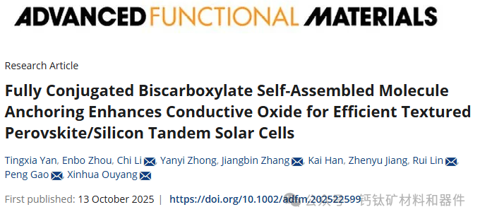 近日,福建农林大学绿色光电器件与储能电池欧阳新华教授团队,基于前期本团队在钙钛矿/硅叠层电池空穴选择层的研究基础(Adv. Mater. 2025, 37(29), 2504520),在钙钛矿/硅叠层空穴选择层方面取得又一重要进展。相关成果“Fully conjugated biscarboxylate self-assembled molecule enhances the anchoring of conductive oxide for efficient textured perovskite/silicon tandem solar cells(全共轭双羧酸自组装分子构筑高性能绒面钙钛矿/硅叠层太阳能电池)”为题发表在国际高质量材料期刊Advanced Functional Materials(《先进功能材料》)上。