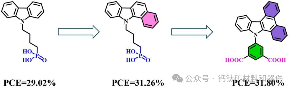 针对钙钛矿/硅叠层太阳能电池空穴选择层存在的导电率低、能级失配、酸性强、绒面容忍差的问题,本研究提出一种新型全共轭双羧酸锚定自组装空穴选择层,通过双碳酸基团的引入,利用全共轭结构限制其酸性,增强其与导电氧化物间的相互作用,改善其薄膜的均匀性与覆盖率,优化上层钙钛矿层结晶,结合分子的大偶极矩,调控能量排列,提升薄膜的空穴提取效率。