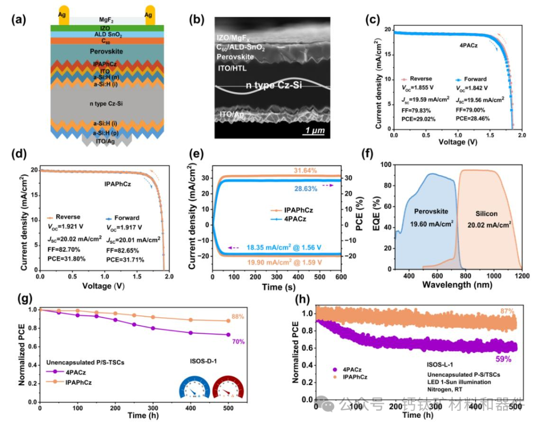 基于本策略合成的空穴选择层分子IPAPhCz,利用其作为构筑宽带隙(~1.68 eV)单结钙钛矿太阳能电池(PSC)的空穴传输层,实现了光电转换效率(PCE)为22.78%光伏器件的制备,较之商业化4PACz(PCE=20.64%)电池的效率提升了~10.37%。进一步地,通过引入IPAPhCz作为双绒面钙钛矿/硅两端子叠层电池(P/S-TSCs),器件的PCE高达31.80%(1 cm2)的最高PCE,相较于4PACz作为空穴选择层的电池(PCE=29.02%),效率提升了9.58%。值得注意的是:利用IPAPhCz构筑的单结与叠层电池均展现出优异的光热稳定性。
