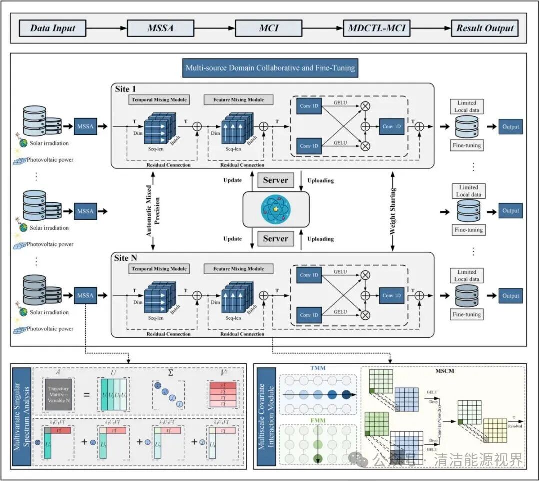 这项技术的精妙之处在于其多层次的处理架构。就像一位经验丰富的医生通过多项检查综合判断病情,该技术首先通过多元奇异频谱分析对原始数据进行“降噪处理”,剔除干扰信息;接着运用轻量级多尺度协变量交互技术,深入挖掘不同变量间的内在关联;最具创新性的是多域协作迁移学习策略,它能够让数据质量较差的电站“借用”其他电站的学习经验,显著提升了在缺失数据条件下的预测稳定性。