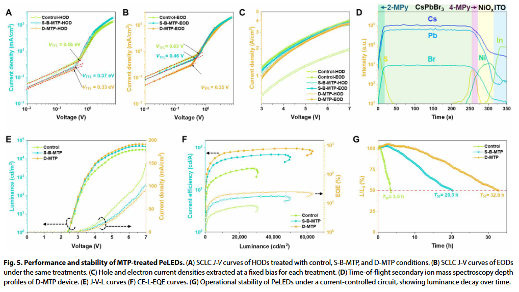 优化后的PeLEDs实现了24.67%的最大外量子效率和95.01 cd/A的电流效率,为溶液加工多晶CsPbBr₃基PeLEDs中最高值。此外,在初始亮度1000 cd/m²下,器件工作半衰期显著延长近10倍。