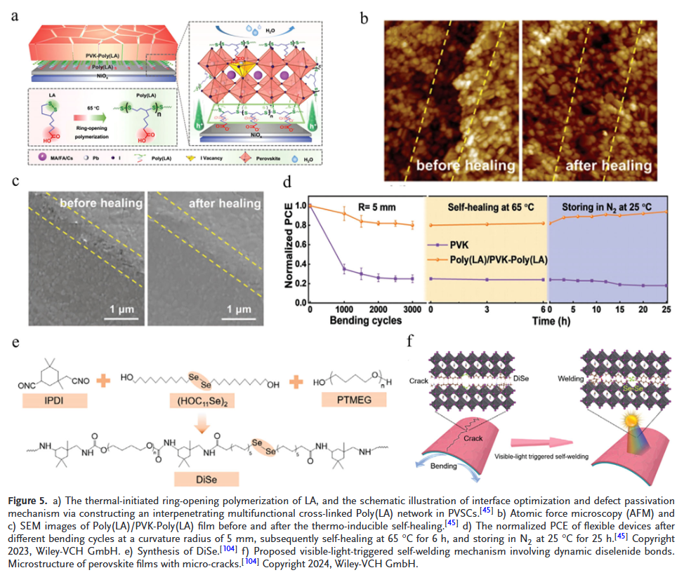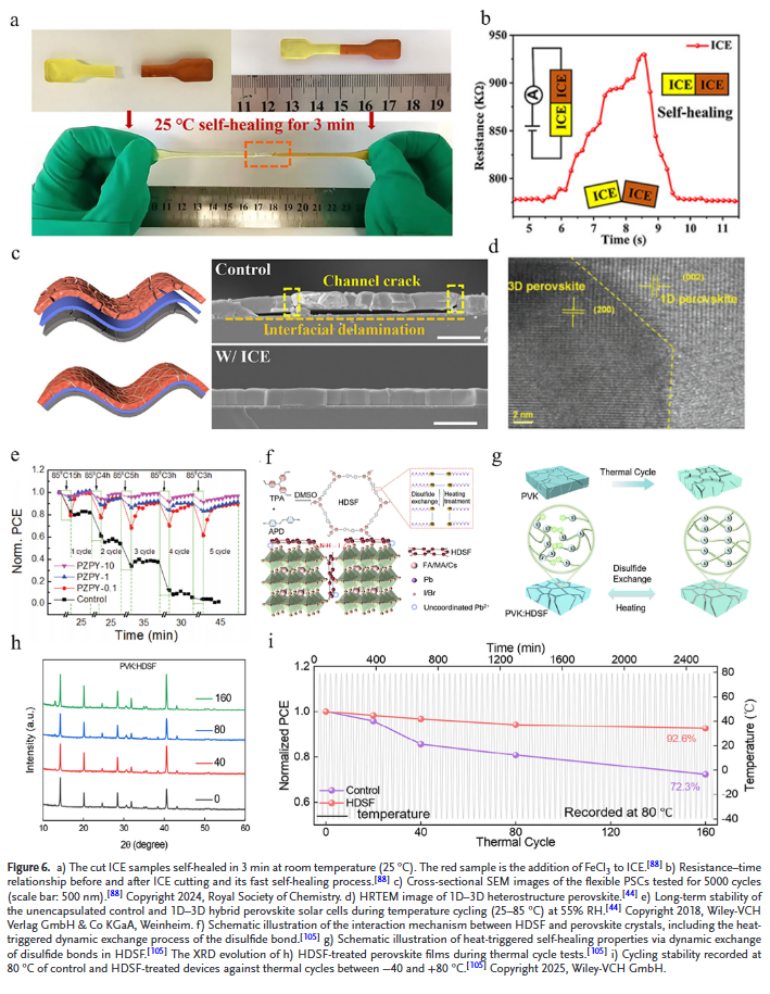 - 系统解析自愈合机制与策略从组分调控、聚合物网络构建到动态键合系统,全面梳理了钙钛矿在光、热、湿、机械应力下的自愈合路径,为材料设计与器件优化提供理论依据。