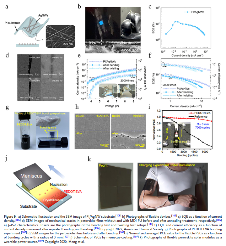 本综述美国圣母大学Qing Cao、河南大学李萌和东南大学李桂香等人系统阐述了钙钛矿的降解路径(可逆与不可逆过程)及缺陷自愈合的基本机制,重点分析了三类主要策略:i)组分工程调控缺陷动态;ii)引入强韧聚合物/杂化网络以抑制机械与环境降解;iii)构建具有动态键合能力的自愈合体系。文中结合典型研究案例,分析了自愈合机制的激活条件、修复机理以及在弯曲疲劳、热循环和长期光照下的稳定性提升效果。