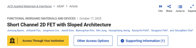 该工作介绍一种新型的短沟道二维场效应晶体管(FET),通过构建斜坡架构实现纳米级沟道长度,无需光刻技术。利用六方氮化硼(h-BN)隧穿层,有效缓解短沟道效应(SCE),实现了高开关比和低亚阈值摆幅(SS)。该斜坡架构短沟道FET(SSFET)展现出超过10⁵的开关比、160 mV/dec的亚阈值摆幅和3.70 μA的导通电流。这种新方法为实现纳米级FET提供了创新路径,无需复杂制造工艺,为未来应用提供高开关比、高开关速度和增强的载流子迁移率。该成果以题为“Short Channel 2D FET with Sloped Architecture”发表于ACS Applied Materials & Interfaces期刊。