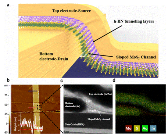 图1. (a)通过顺序堆叠金电极、单层MoS2和h-BN隧穿层制备的斜沟道超短沟道FET示意图。(b)斜沟道短沟道FET的原子力显微镜形貌图及单层MoS2的线轮廓图(插图)。(c)截面透射电镜图像证实存在亚10纳米斜沟道区域及空气间隙。(d)斜沟道短沟道FET的EDS元素分布图:钼(红色)、硫(黄色)、金(绿色)、铟(蓝色)。