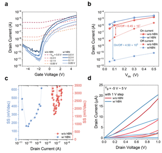 图2. (a)含h-BN隧穿层(蓝线)与不含h-BN层(红点线)的斜沟道短沟道FET转移特性曲线。(b)从(a)转移曲线提取的导通电流(Vg=5V时)与关断电流随Vds的变化关系。(c)转移特性曲线提取的亚阈值摆幅(SS)值。(d)含与不含h-BN层的斜沟道短沟道FET输出特性曲线。。
