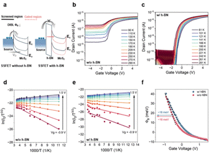图3. (a)金电极(黑线,屏蔽区)和斜沟道区(红线,栅控区)构成的夹层区域能带图及电荷传输机制,右图为含h-BN隧穿层结构,左图为无h-BN层结构。(b)、(c)分别为含与不含h-BN层的斜沟道短沟道FET的温度依赖性电荷传输特性。(d)、(e)斜沟道短沟道FET的阿伦尼乌斯曲线。(f)提取的肖特基势垒高度随栅压Vg的变化关系。