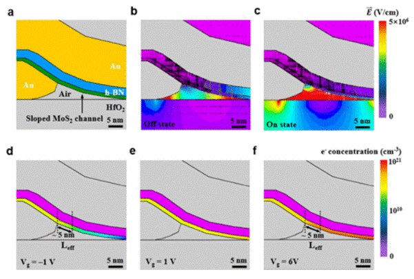 图4. (a) SSFET中电场分布和载流子浓度变化的模拟结构示意图。(b)、(c) 在关态(Vg = −1 V)和开态(Vg = 6 V)下,SSFET结构中的电场分布模拟结果。(d)、(e)、(f) 分别在Vg = −1 V、1 V和6 V时,斜坡沟道区域电子浓度的变化情况。