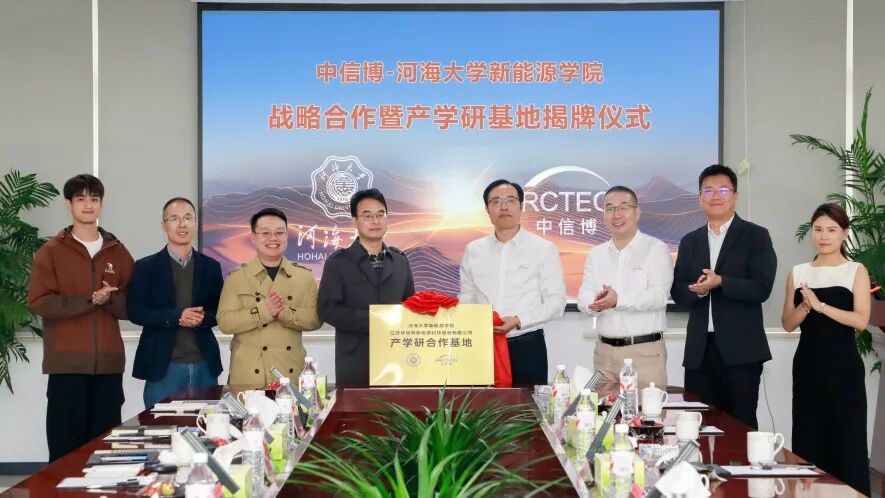 近日,中信博与河海大学新能源学院签署产学研合作战略协议,同时正式迎来产学研合作基地揭牌,河海大学新能源学院副院长白建波、中信博高级副总裁俞正明、新能源战略技术研发顾问陈昌宏、北部大区总经理卫效等出席揭牌仪式。
