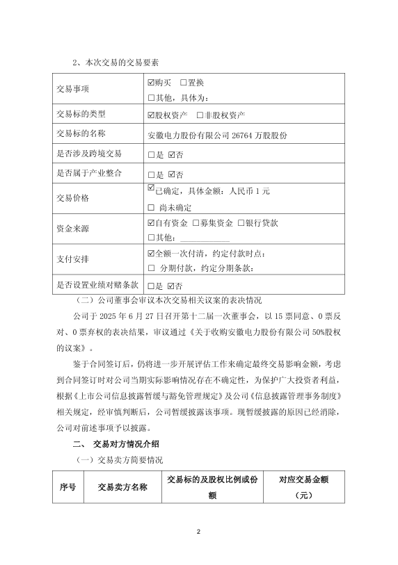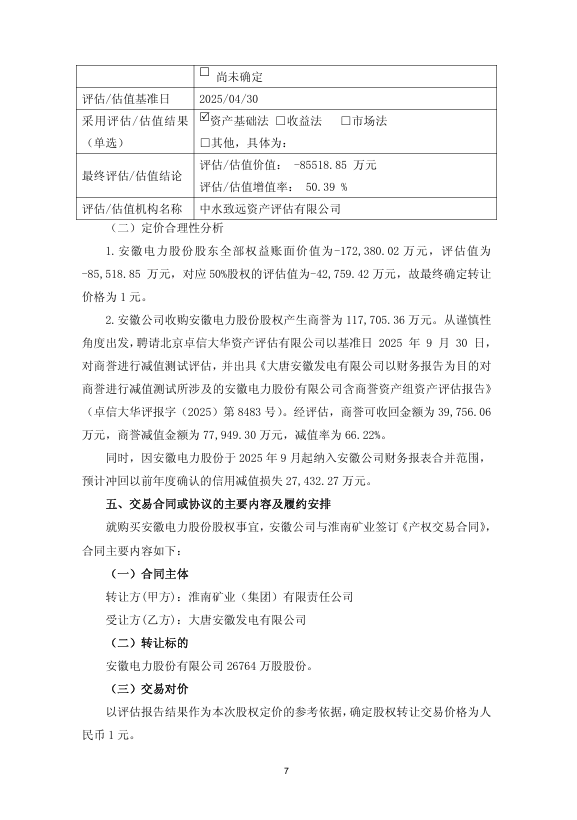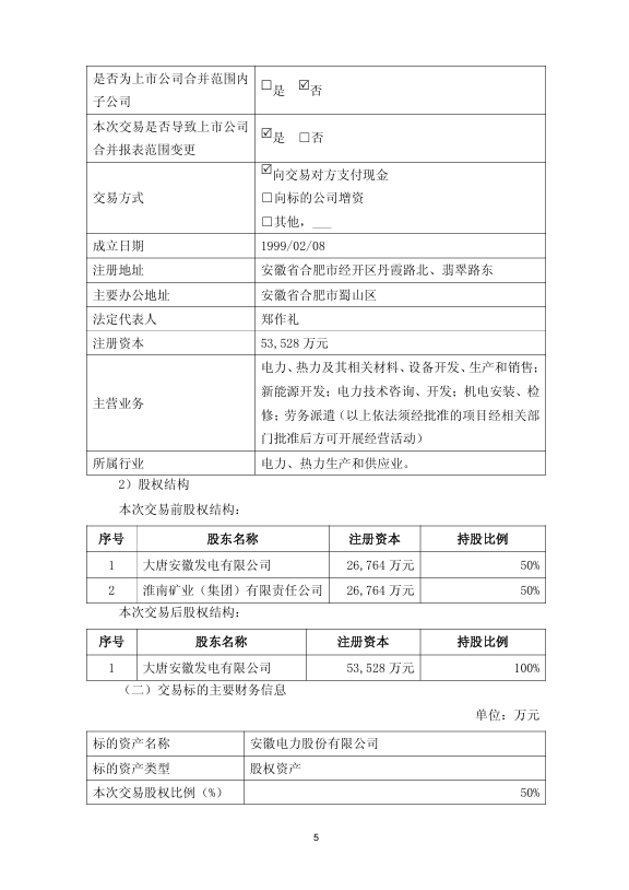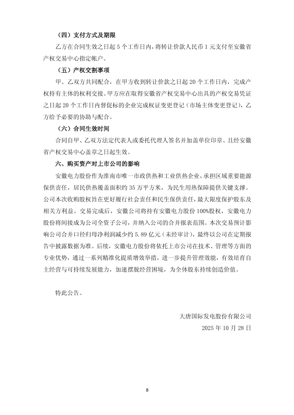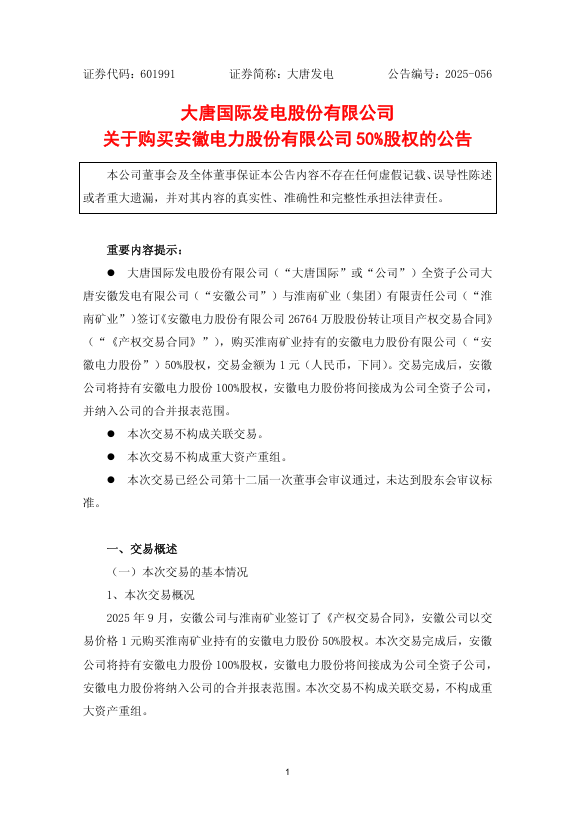 2025 年 10 月 28 日,大唐国际发电股份有限公司(证券代码:601991,简称“大唐发电”)发布公告,宣布其全资子公司大唐安徽发电有限公司(简称 “安徽公司”)以 1 元价格收购淮南矿业(集团)有限责任公司(简称 “淮南矿业”)持有的安徽电力股份有限公司(简称 “安徽电力股份”)50% 股权。交易完成后,安徽公司将持有安徽电力股份 100% 股权,该公司正式成为大唐发电间接全资子公司并纳入合并报表范围。
