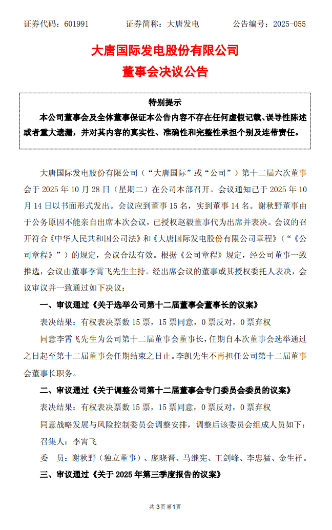 10月28日,大唐发电(601991.SH)召开董事会,审议通过《关于选举公司第十二届董事会董事长的议案》。