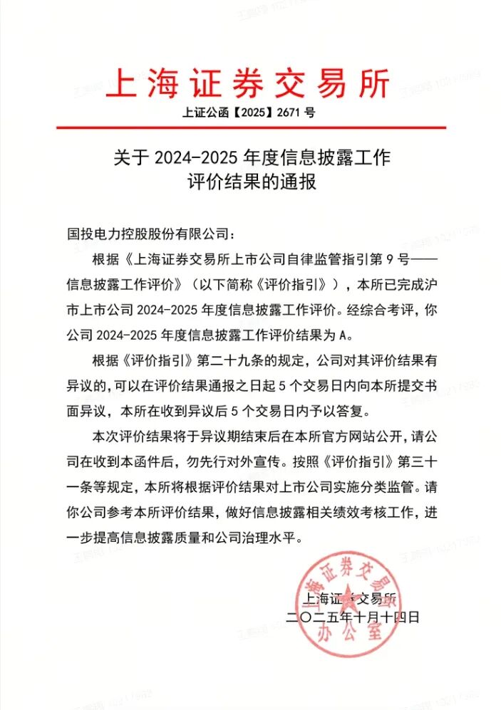 国投电力2025年再次获得上海证券交易所信息披露A级评价(最高评级),这是公司连续九年获此殊荣。此次参与考评的沪市上市公司共计2263家,其中A级占比约19%;连续九年荣获A级评级的上市公司仅有55家,占比2.43%。