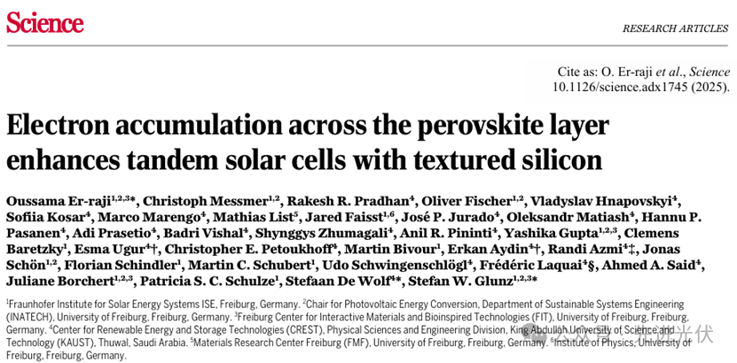 本文针对全绒面钙钛矿/硅叠层太阳能电池中钙钛矿与电子传输层(C60)界面处的电荷传输损失和界面复合问题,提出了一种基于1,3-二氨基丙烷二氢碘化物(PDAI)分子表面处理的解决方案。通过光电器件模拟和实验验证,研究发现PDAI分子与钙钛矿表面相互作用,形成了一个指向钙钛矿的正向偶极。这一偶极显著减小了钙钛矿与C60之间的导带偏移,从而在界面处诱导了电子积累,有效抑制了界面复合,将钙钛矿子电池的内建电压(iVoc)从1.12 V提升至1.20 V。更重要的是,由于钙钛矿体相的本征特性,这种电子积累效应延伸至整个钙钛矿吸收层,使其平均电子浓度提升约40倍,从而大幅增强了电子电导率,降低了传输损失。基于此策略制备的全绒面叠层电池效率从29.1%提升至33.1%,开路电压达到2.01 V,填充因子提升至81.6%。户外稳定性测试和加速老化测试均表明,PDAI处理有效抑制了离子迁移,显著提升了器件的长期运行稳定性。