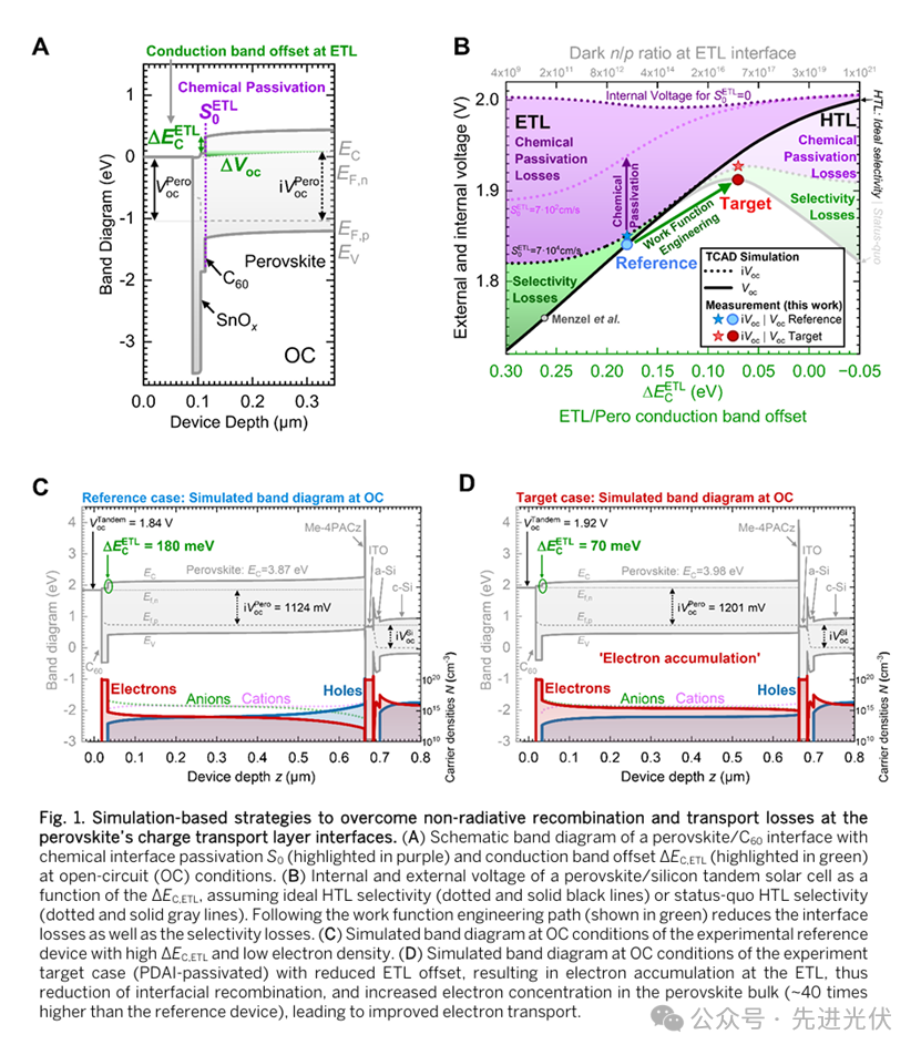 1)揭示了“深度”场效应钝化机制并关联了界面与体相电学性质:该研究通过系统的光电器件模拟和实验证实,通过PDAI分子调控界面偶极以减小导带偏移,其作用远不止于界面复合的抑制。由于钙钛矿体相的本征特性,诱导的电子积累区域能够延伸至整个吸收层,从而显著提升体相电子浓度和电导率,从根本上降低了传输损失。这种从界面延伸至体相的“深度”场效应钝化机制,为理解并同时提升器件的Voc和FF提供了全新的物理图像。