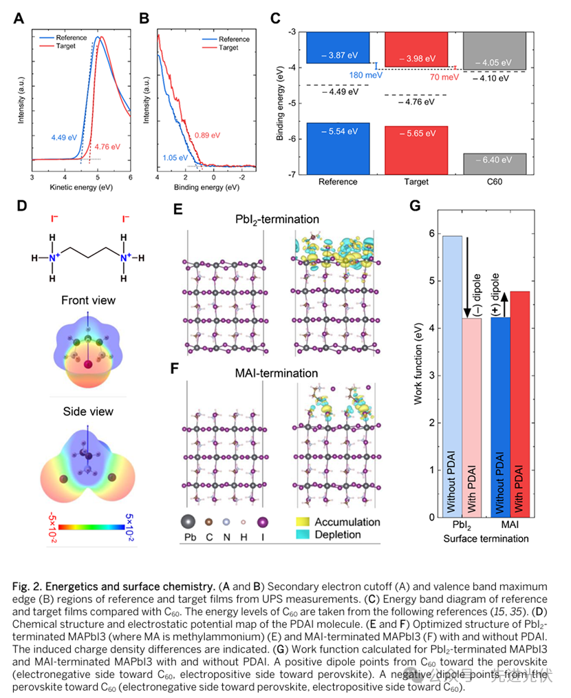 Figure 2此图通过实验表征和理论计算深入揭示了PDAI分子与钙钛矿表面的相互作用及其对界面能带结构的影响。UPS测量结果(图A, B)显示,PDAI处理使钙钛矿表面的功函数从4.49 eV显著增加至4.76 eV。通过对比电离势的变化(图C),发现Wf和IP的变化量相近,表明这种变化主要源于表面偶极的形成,而非费米能级在带隙内的移动。构建的能带示意图(图C)表明,PDAI处理将钙钛矿与C60之间的导带偏移从180 meV成功减小到70 meV。DFT计算发现,其在富PbI2终止的表面上会形成负向偶极,而在富MAI终止的表面上则形成正向偶极。由于本文使用的混合两步法倾向于形成富有机物的表面,实验结果与后者相符,这解释了与先前基于一步法研究观察到的现象差异,突出了表面终止化学对界面工程的决定性影响