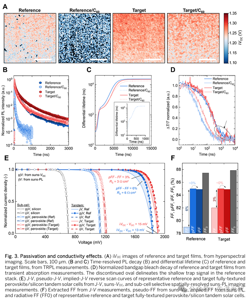 Figure3通过多种先进表征手段验证了PDAI处理对器件性能的实际提升效果。图A的超光谱PL成像显示,PDAI处理不仅将钙钛矿薄膜的平均iVoc提高了20 mV,还显著改善了其空间均匀性。在沉积C60后,参考样品的iVoc大幅下降且分布变宽,而PDAI处理后的样品iVoc得以保持且分布更窄,证明了其强大的界面保护作用。TRPL和差分寿命分析(图B, C)表明,PDAI处理将界面复合主导的微分寿命从~1 μs提升至~10 μs。瞬态吸收光谱(图D)进一步证实,PDAI处理消除了参考样品中存在的浅陷阱态信号。最关键的分析来自suns-Voc测量(图E, F):它显示PDAI处理器的伪填充因子与参考器件相同,但实际J-V测得的FF与pFF的差值从6%缩小到3%,对应的串联电阻在MPP处从6 Ω·cm²降至3 Ω·cm²。这直接证明了FF的提升主要源于体相电导率增加导致的传输损失的降低,而非选择性或复合损失的改善。