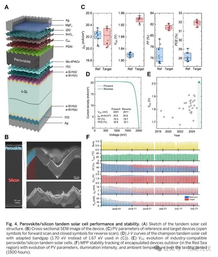 Figure 4展示了最终器件的卓越性能和稳定性。图A和B分别为器件结构示意图和截面SEM图,显示了在产业标准绒面硅上的完美共形覆盖。统计箱线图(图C)证明PDAI处理显著且一致地提升了所有光伏参数,使平均效率从29.1%提升至32.3%。通过将钙钛矿带隙微调至1.70 eV以优化电流匹配,冠军器件(图D)实现了33.1%的效率和2.01 V的创纪录高开路电压。图E的表明,该工作使全绒面叠层电池的Voc与基于抛光硅的纪录器件持平,证明其界面钝化已无固有劣势。在红海沿岸炎热潮湿的环境下,封装后的PDAI处理器件在超过1500小时的MPP跟踪中,其短路电流密度(Jsc)保持稳定,而参考器件的Jsc则持续衰减。结合BACE测量发现PDAI处理器的可移动离子浓度更低,这为其优异的运行稳定性提供了机理解释,证明了高性能与高稳定性可以兼得。