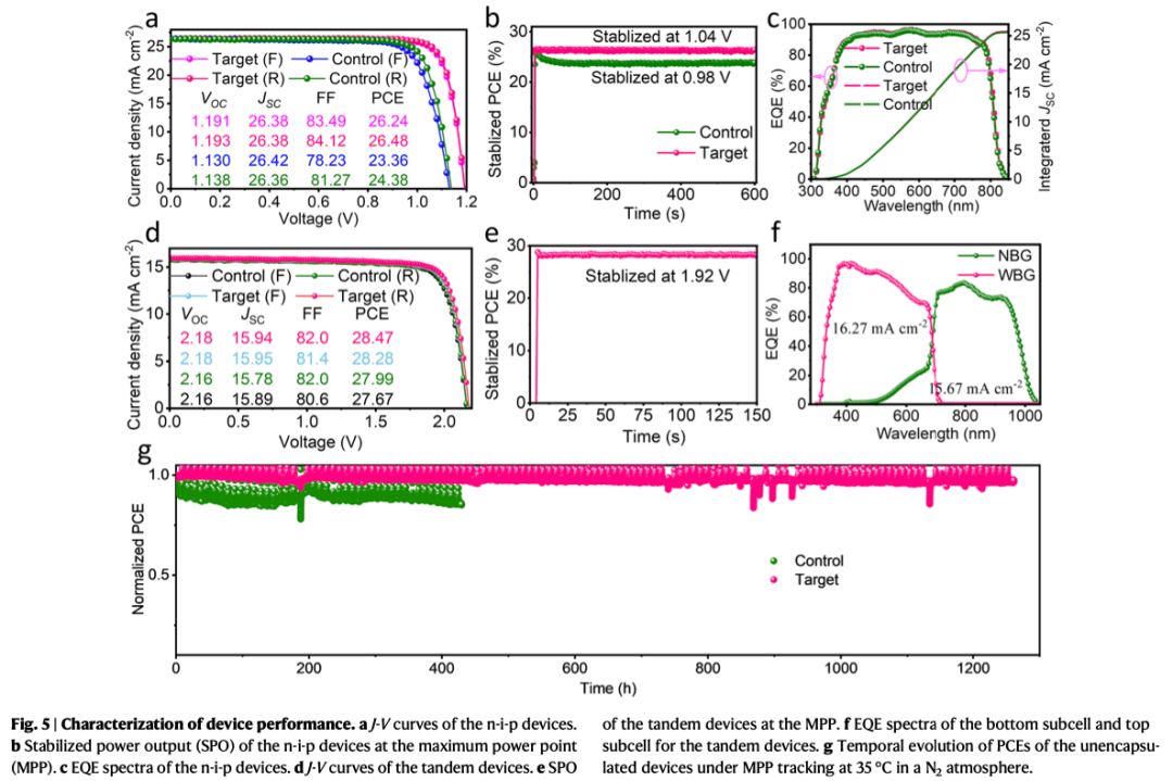 - 实现高效率与高稳定性兼备,具备强通用性与产业化前景:未封装器件在1200小时连续运行后效率几乎无衰减;在n-i-p、p-i-n及全钙钛矿叠层结构中分别实现26.48%、26.34%与28.47%的高效率,展示出广泛的器件适用性与商业化潜力。