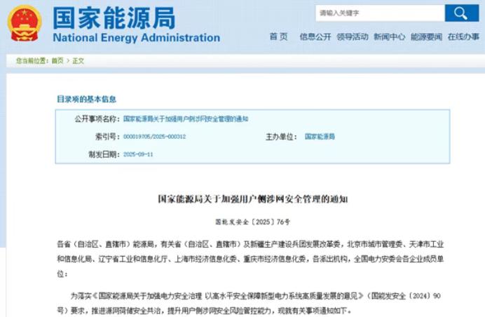 近日,国家能源局综合司发布《关于加强用户侧涉网安全管理的通知》(以下简称《通知》),从国家层面系统构建了用户侧涉网安全管理的顶层设计和全链条管理体系。《通知》中指出用户侧涉网安全管理的总体要求,明确各相关主体的权责范围,推动用户侧涉网安全管理迈入制度化、协同化和精细化管理。