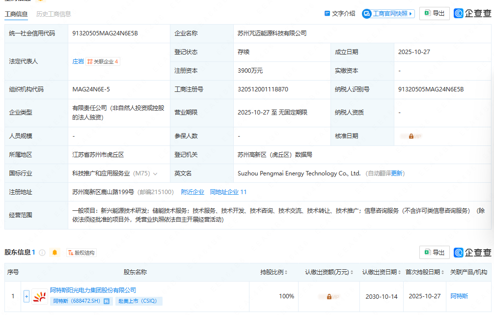 经营范围包含:新兴能源技术研发;储能技术服务等。企查查股权穿透显示,该公司由阿特斯全资持股。