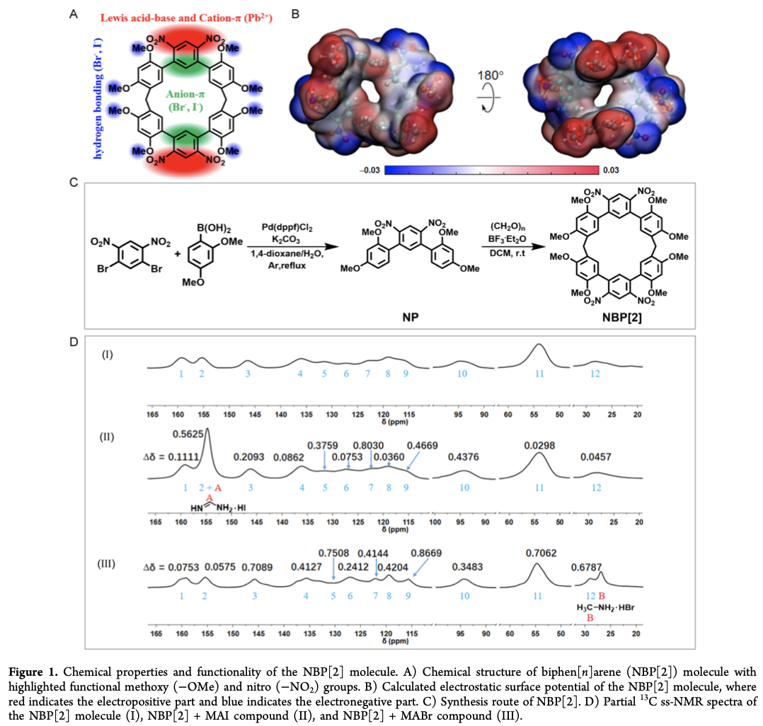 为解决这一问题,香港理工大学殷骏、天津师范大学李春举和阿卜杜拉国王科技大学Osman M. Bakr等人开发了一种新型电子缺陷型 biphen[n]arene 大环分子 NBP[2],通过单体 2,2″,4,4″-四甲氧基-4′,6′-二硝基-1,1′,3′,1″-三联苯(NP)与多聚甲醛缩合合成。将该大环分子通过反溶剂注入法引入钙钛矿薄膜中,可调控钙钛矿结晶过程并抑制卤素阴离子迁移。此外,NBP[2] 可通过路易斯酸碱作用和阳离子-π 作用与未配位的卤素离子和 Pb²⁺ 结合,减少本征缺陷。