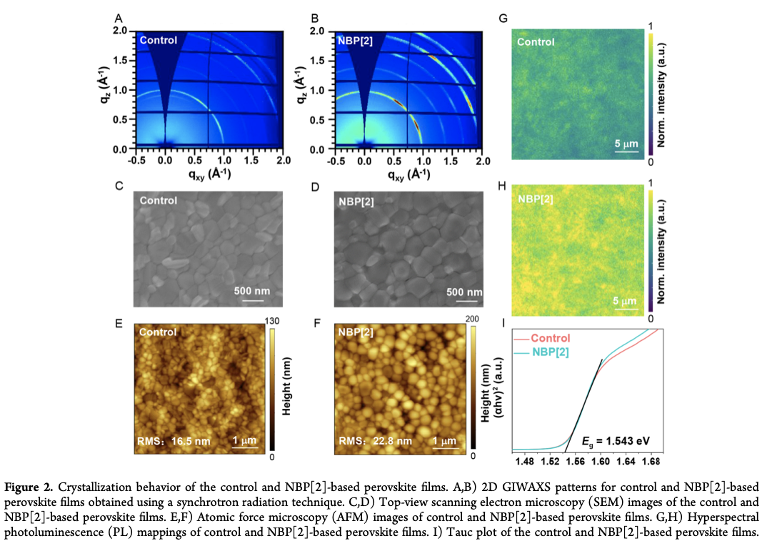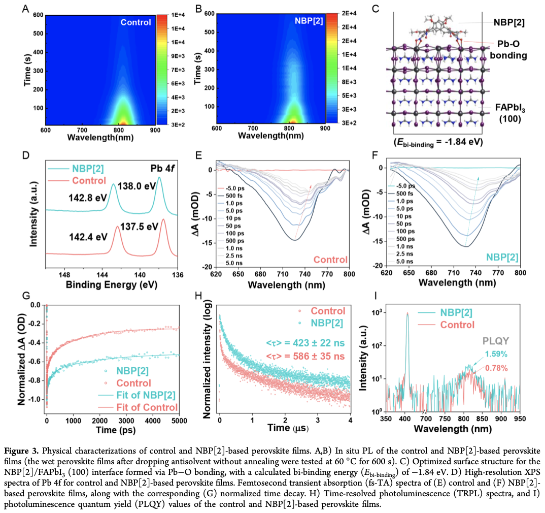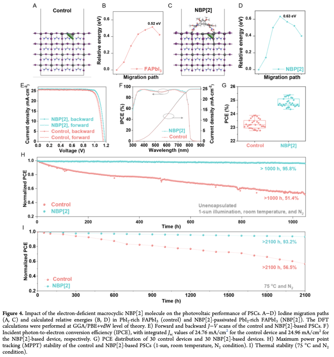 最终,基于 NBP[2] 的 PSCs 实现了 25.38% 的 PCE(对照组为 23.89%),并在室温 N₂ 气氛下 1 太阳光照射下进行 1000 小时最大功率点跟踪后仍保持 95.8% 的初始效率。