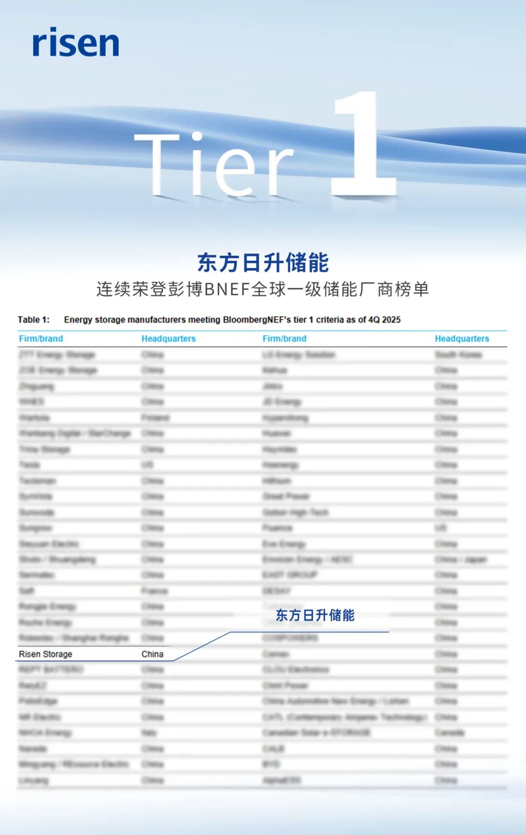 彭博新能源财经(BloombergNEF)近日发布2025年第四季度全球储能系统制造商评级,东方日升储能凭借卓越的产品性能、可靠的全球交付能力及持续扩大的市场影响力,再度荣登Tier 1榜单。这一权威认可标志着东方日升在储能领域的综合实力获得国际机构长期肯定,品牌全球竞争力进一步提升。
