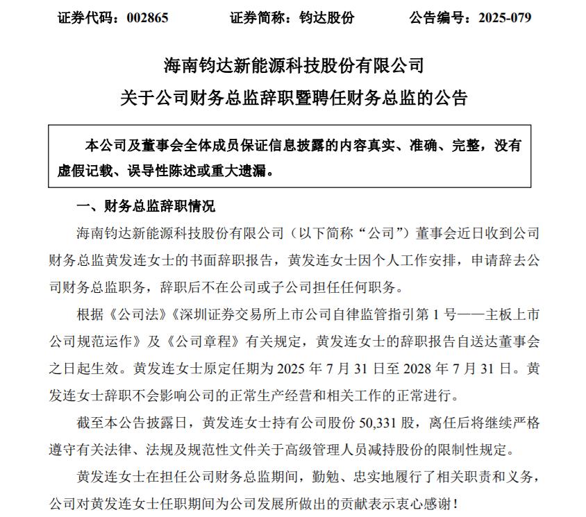 近日,钧达股份(002865.SZ)发布公告,公司财务总监黄发连因个人工作安排辞职。公司同步宣布聘任下属子公司高管周小辉接任。
