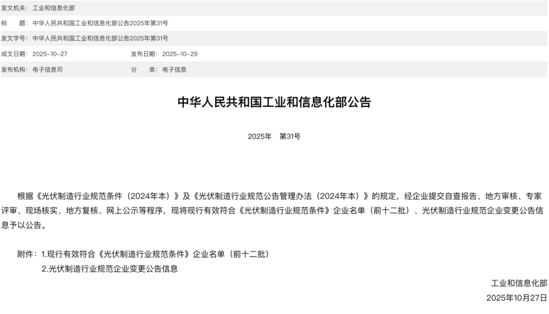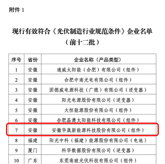 10月29日,工业和信息化部发布公告,对现行有效的《光伏制造行业规范条件》企业名单(前十二批)予以集中公告。华晟新能源凭借在技术创新、产品质量、绿色制造及规范管理等方面持续的卓越表现,继续位列该权威名单之中。此次公告是对华晟新能源长期符合国家行业最高规范标准、稳健运营与综合实力的再次确认。