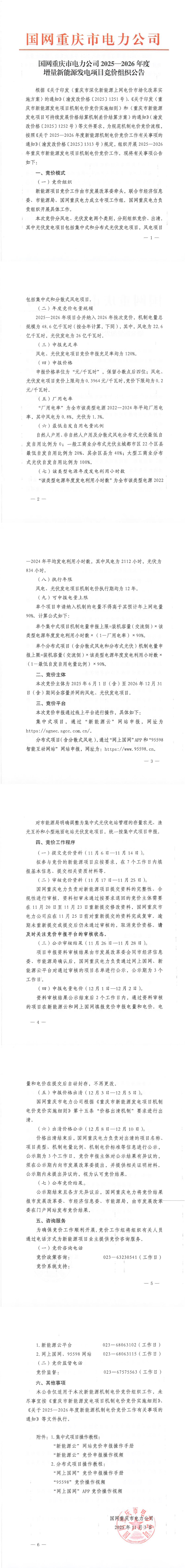 11月3日,国网新能源云发布 国网重庆市电力公司2025-2026年度增量新能源发电项目竞价组织公告。公告主要内容如下: