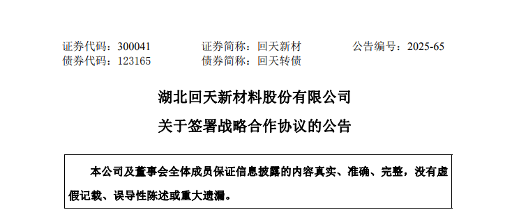11月3日晚间,回天新材发布公告称,2025年11月3日,公司与重庆太蓝新能源有限公司签订了《战略合作协议》,拟充分发挥双方在各自领域的管理、技术、渠道、平台等优势,围绕固态电池及其关键材料领域的业务经营、产融结合等开展战略合作。
