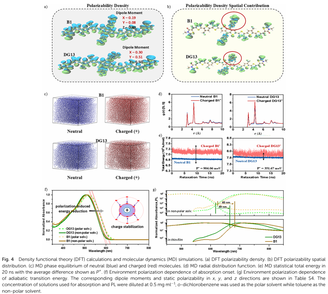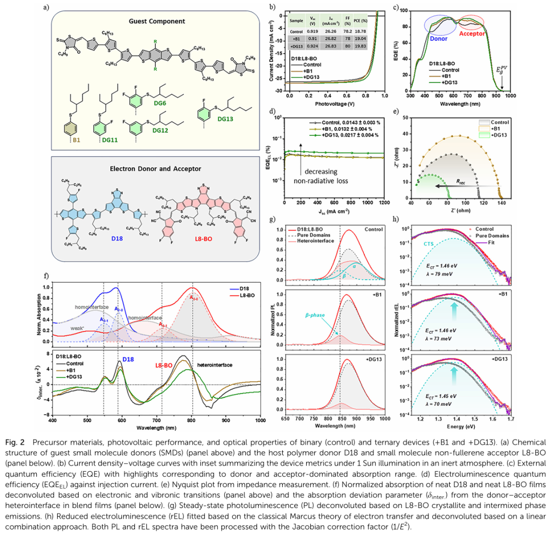 - 极化率调控抑制复合损失:低极化率小分子(如DG13)可增强短程迁移率,减少自由电荷在界面处的停留时间,从而抑制复合。