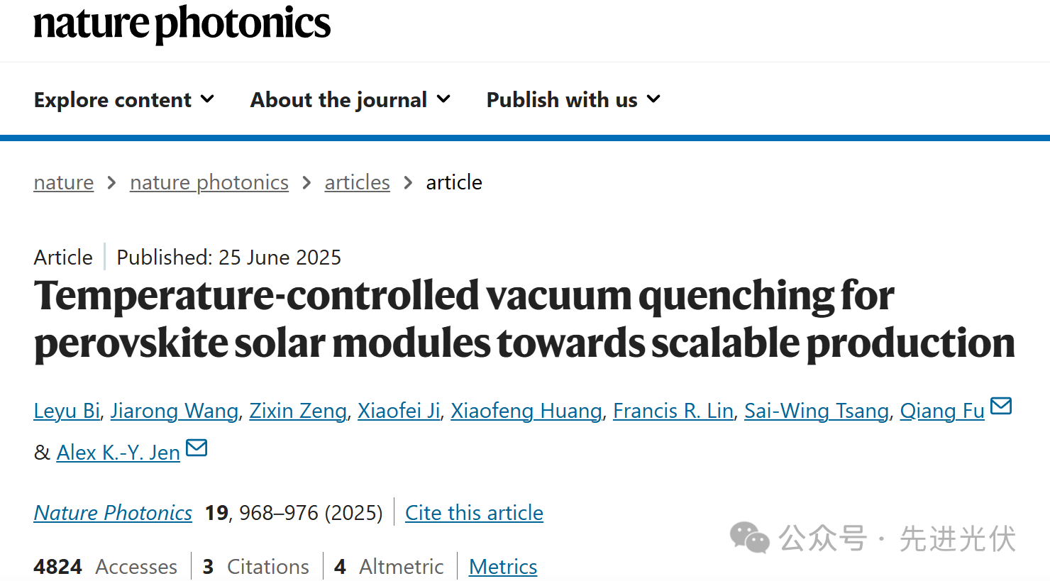 Bi, L., Wang, J., Zeng, Z. et al. Temperature-controlled vacuum quenching for perovskite solar modules towards scalable production. Nat. Photon. (2025). https://doi.org/10.1038/s41566-025-01703-3