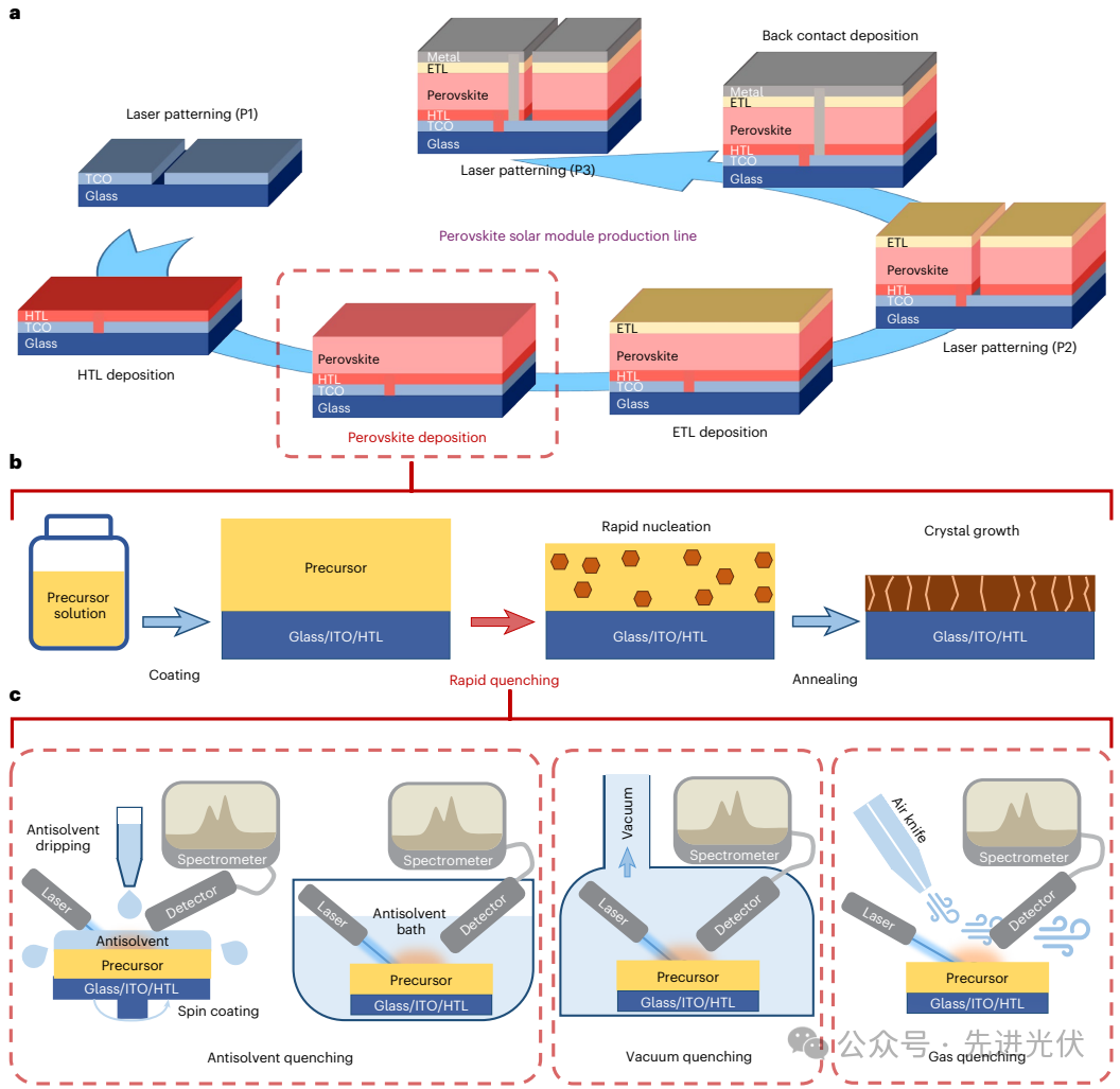 图1通过示意图系统展示了钙钛矿太阳能组件的完整生产工艺流程,特别突出钙钛矿薄膜沉积这一关键环节,并对比了反溶剂、真空和气体淬火三种主流淬火成核方法的原位光致发光监测原理,揭示了溶液法沉积中涂层制备、快速淬火成核及退火晶体生长三个核心阶段的动态关联性。