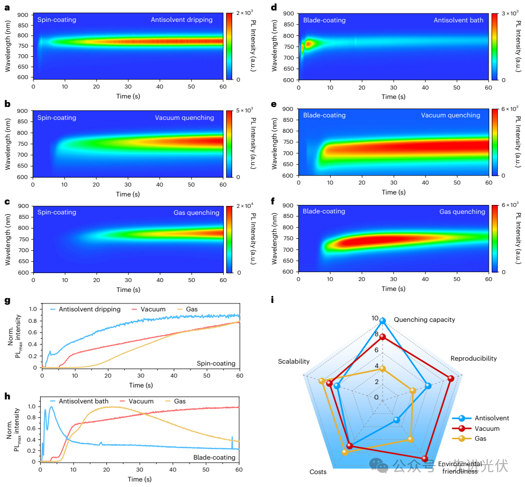 图2通过旋涂和刮涂两种工艺下的原位光致发光热图对比,清晰呈现了反溶剂、真空和气体淬火三种成核方法的动力学差异,其中真空淬火在成核速率可控性与环境友好性方面展现显著优势,而雷达图则从淬火能力、重复性等五个维度综合量化了不同方法的适用性特征。