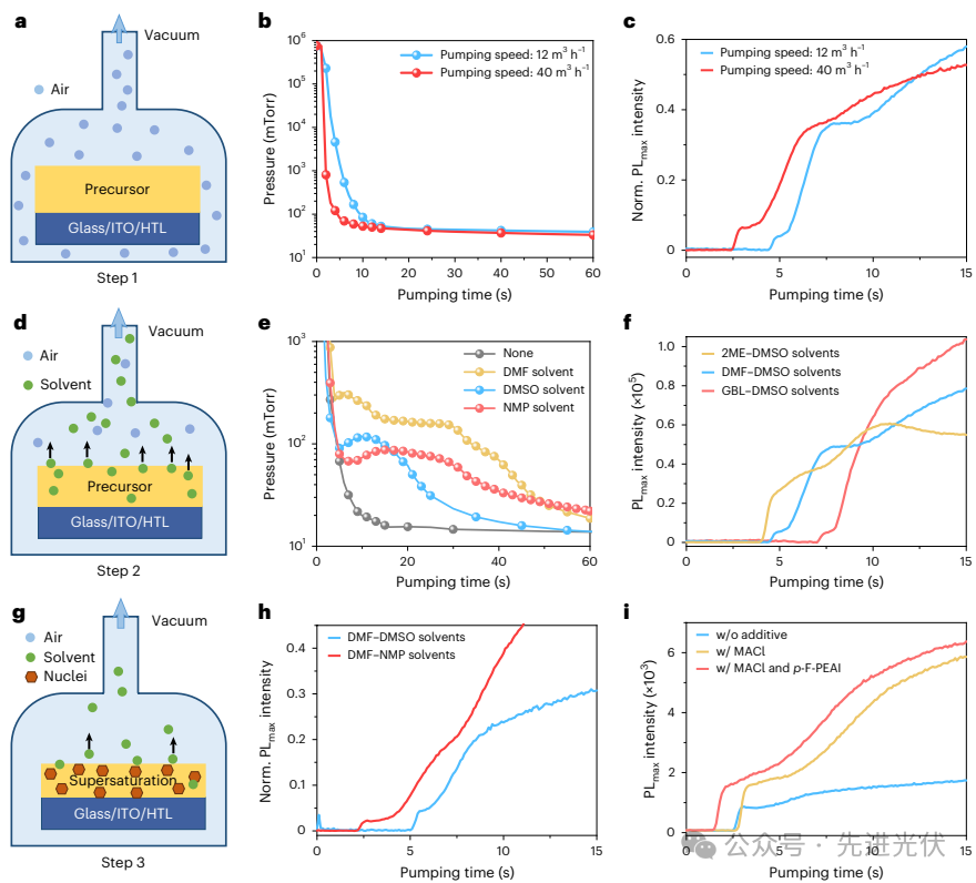 三阶段真空淬火机制解析:首次将真空淬火过程划分为腔体排气、溶剂挥发与成核生长三阶段,系统揭示抽速、溶剂体系与添加剂对成核过程的影响规律。