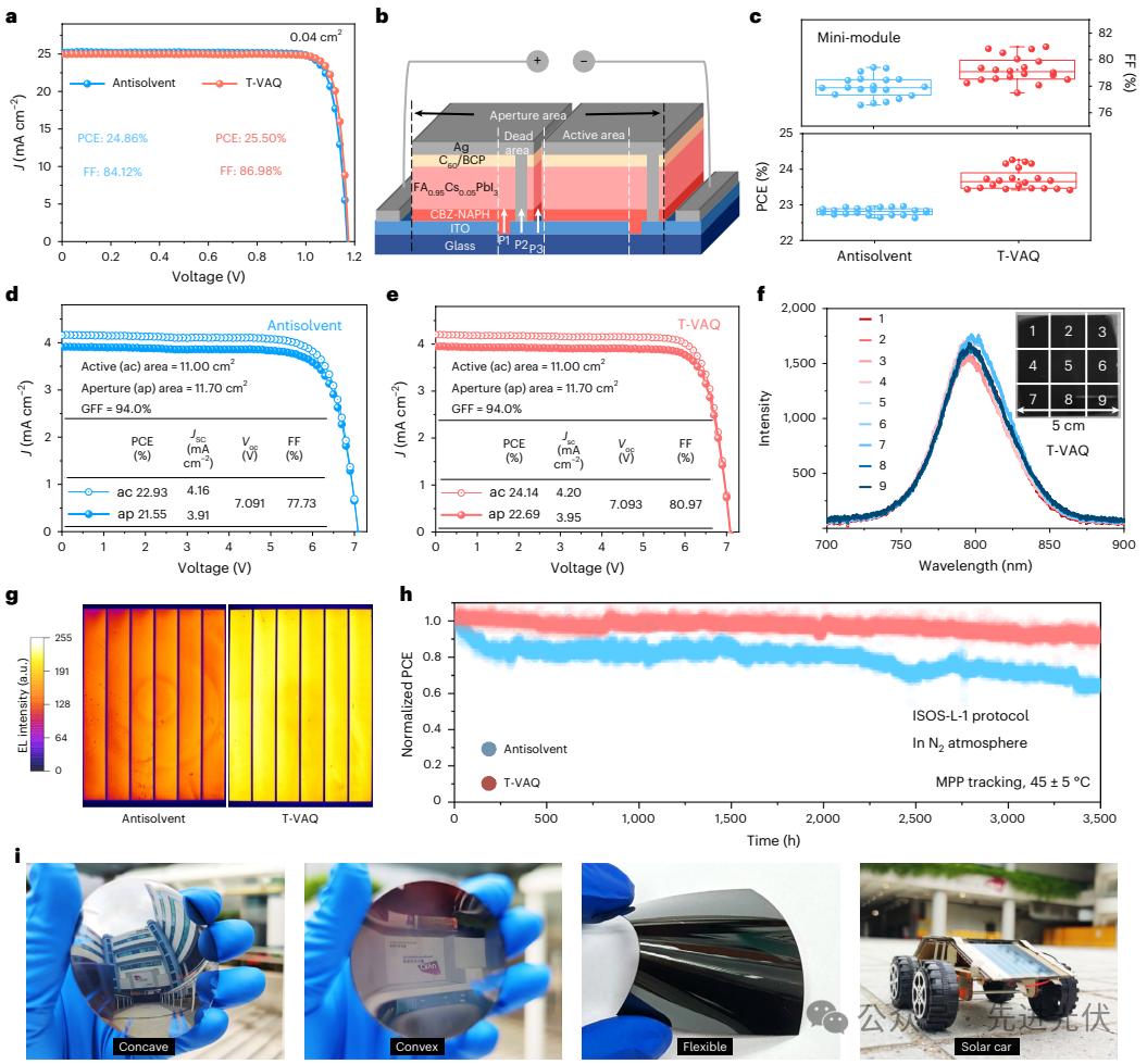 图5从器件性能角度全面评估了T-VAQ技术的优势,小型组件统计数据显示其平均效率(23.72%)显著高于反溶剂淬火(22.81%),电致发光成像证明大面积薄膜均匀性提升,最大功率点跟踪测试表明T-VAQ器件在45°C持续运行3500小时后仍保持93%初始效率,同时展示了该方法在柔性/弯曲基底上的普适性应用潜力