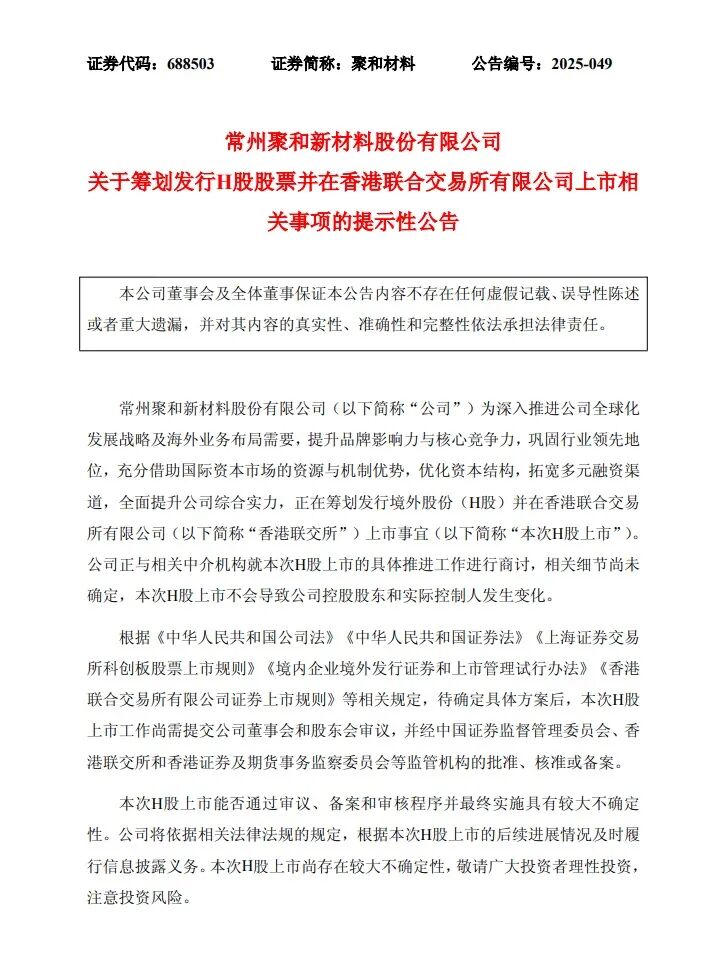 11月3日下午,聚和材料发布公告称,该公司正在筹划发行境外股份(H股)并在香港联合交易所有限公司(简称“香港联交所”)上市事宜。