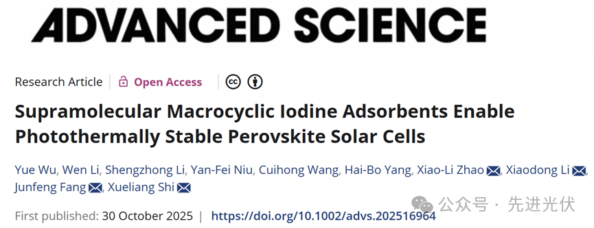 Wu Y, Li W, Li S, et al. Supramolecular Macrocyclic Iodine Adsorbents Enable Photothermally Stable Perovskite Solar Cells. Advanced Science (2025). https://doi.org/10.1002/advs.202516964