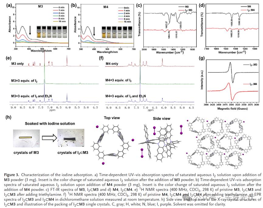 3.图三系统研究了大环分子M3与M4的碘吸附性能与作用机制。