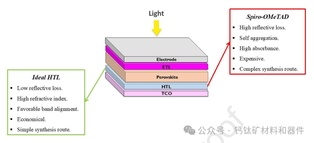 使用 Spiro-OMeTAD 的缺点与理想 PSCs 空穴传输层(HTL)具备的优点。