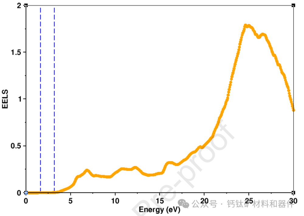 NiO的电子能量损失谱(EELS)。电子能量损失谱(EELS)表示快速电子通过材料时所损失的能量。值得注意的是,能量损失来源于单电子激发和等离子体激发的混合。从上图可以看出,在3.62 eV以下,能量损失要么太小以至于无法在谱图中检测到,要么没有显著的激发过程发生。这解释了为什么在之前的结果中在这些区域未观察到带间跃迁。随着起始能量超过可见光范围的最大边缘,这表明NiO在低能量区域具有较高的光学透射率。此外,由于NiO在3.62 eV以下不导电,因此没有显著的电子传输,这对于空穴传输材料来说是一个关键特性,因为它应充当物理屏障,阻止电子从钙钛矿层传输到电极。在紫外区域,能量损失更多,等离子体峰位于24.60 eV。(消息来源:Ceramics Internationalhttps://doi.org/10.1016/j.ceramint.2025.11.013)