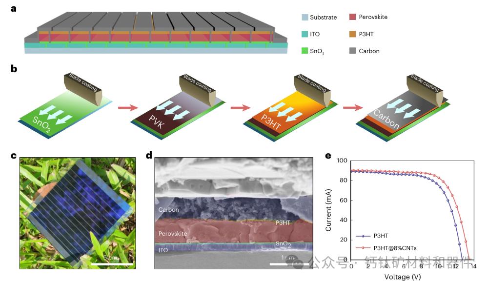 C-PSMs的器件结构与制备。a,器件结构示意图。b,C-PSMs的制备工艺。c,d,C-PSM的照片(c)及剖面扫描电子显微镜图像(d)。e,基于P3HT和P3HT@8%CNTs空穴传输层(HTLs)的C-PSMs的电流-电压(I–V)曲线。