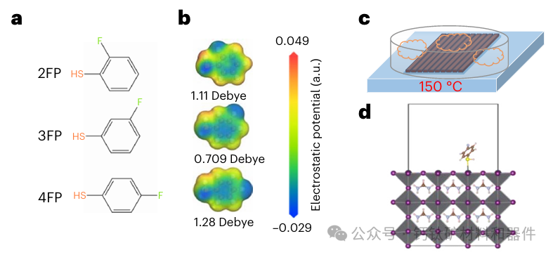 钙钛矿薄膜的蒸汽后处理。a,b, 2FP、3FP 和 4FP 分子的化学结构 (a) 及静电势 (b)。c, 蒸汽后处理示意图。d, 4FP 分子吸附在 FAPbI3 (001) 表面的 DFT 计算。